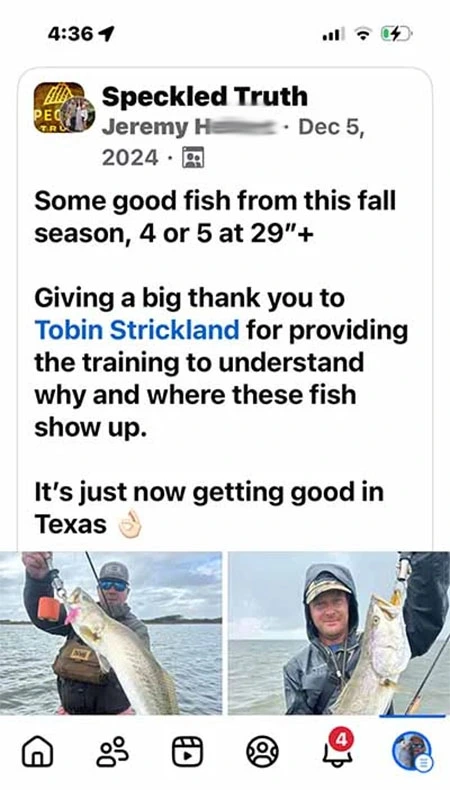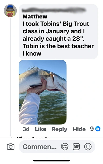 After the training you can contact Captain Tobin at any time and ask if a spot is or isn't a big trout spot. and if the timing or conditions are right for the conditions for your fishing trip.