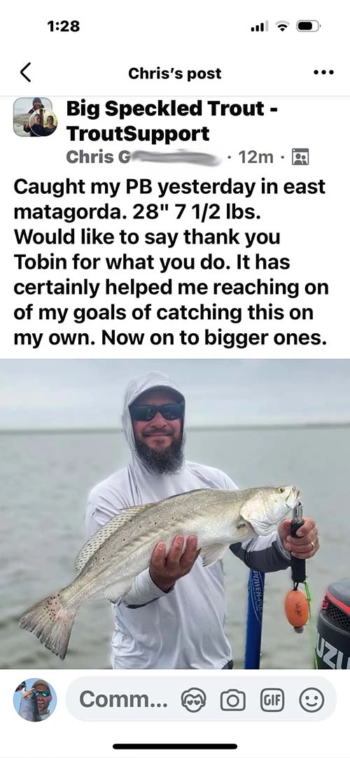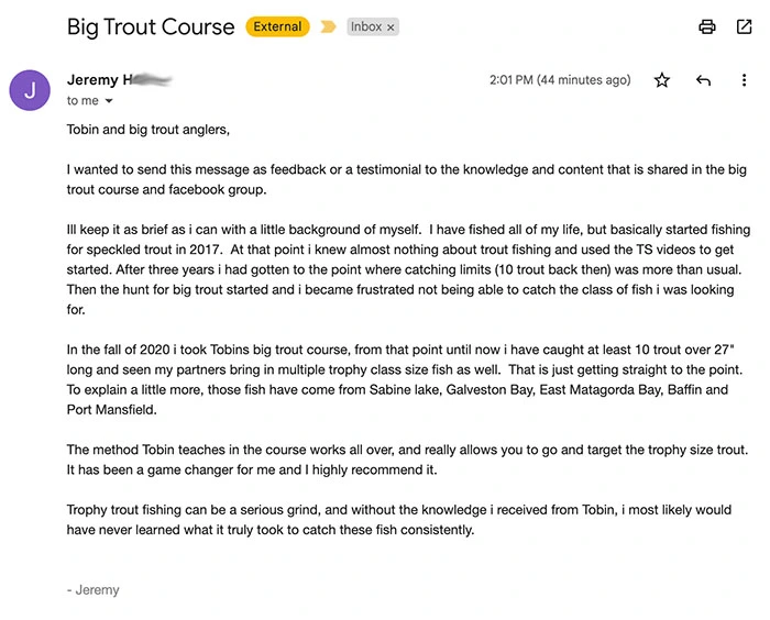 You'll also be put into a private group with the other guys that have taken the course. I had to make this separate from the website since I was getting infiltrated by major fishing clubs and podcasts and some others associated with them. The private group gets videos of my big trout catches or if I want to share something relevant to big trout fishing (none of this is share in Club Texas). Big Trout Group Members can ask anything in the Private Group - as well as ask me privately.